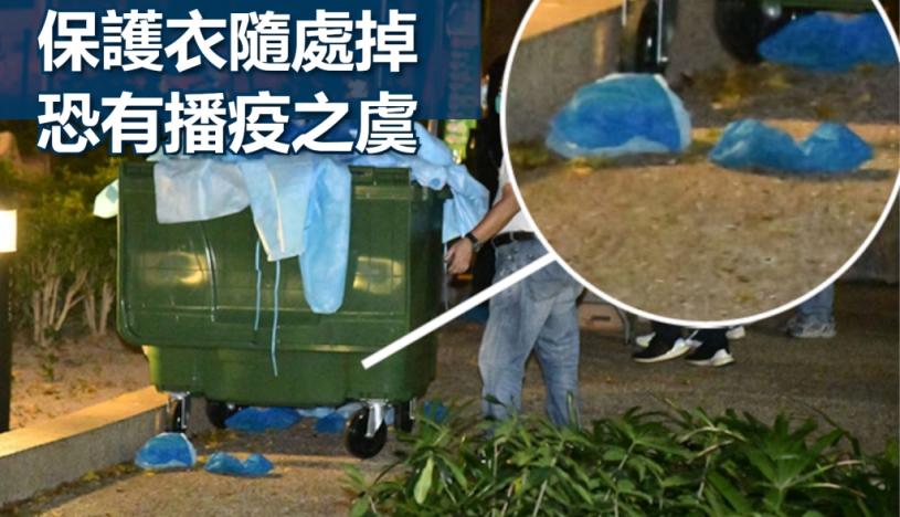 另外,當局亦派多名外判清潔員到上址兩座圍封大廈及垃圾房噴消毒藥水,進行撤底消毒,另有洗街車在上角街外清洗行人路。不過,本報記者於逸葵樓對開公園發現一個大型垃圾收集箱,裡面放有多件已被使用的藍色保護衣,但垃圾箱沒有蓋好,地下更散佈數件用過的保護衣,相信是保安員卸去保護衣後,隨手將保護衣扔棄,恐有播疫風險。