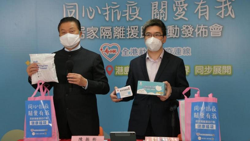 義工將快速測試套裝、口罩、連花清瘟膠囊等中成藥、清潔消毒用品、罐頭等,向各區居家隔離市民派發,有需要市民可以到全港社區抗疫連線的社交網站登記。