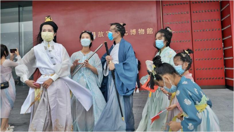 為配合故宮館的歷史氛圍,有市民特地穿上古裝或漢服前來參觀,連「士兵」也在場外接受安檢。打扮成「士兵」的市民指,難得故宮開幕,所以特別穿上古裝配合,並指身穿宋朝服飾,會特別期待欣賞宋朝的文物。