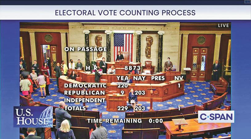 眾議院通過法案,修改已沿用135年的《選舉計數法》(Electoral Count Act),既列明副總統無權推翻各州的選舉人票,又提高國會挑戰州府點票結果的門檻,杜絕未來總統選舉再出現2020年的爭議。政壇預料,法案在參院將面對一定程度的障礙。