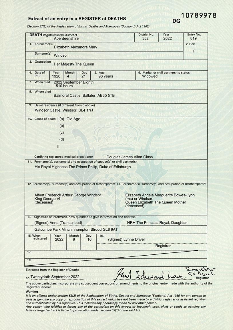 國立蘇格蘭檔案館在29日發布的死亡證顯示,英女王是在英國時間9月8日下午3時10分在蘇格蘭巴爾莫勒爾堡(Balmoral Castle)去世。女王的死亡證由她的女兒安妮公主(Princess Anne)簽署,死因一欄列明是指她因年老死亡。