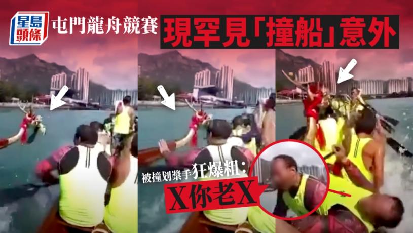 國慶73周年加上香港回歸25周年,屯門青山灣避風塘昨日(2日)舉行龍舟競賽,八場賽事分別於早上9時至下午1時30分進行,期間發生罕見「撞船」意外,一條影片於網上流傳,一艘龍舟在賽事期間高速向右撞向另一艘龍舟,被撞龍舟的划槳手遭撞至「瞓晒身」險墮海,當場怒不可遏,狂爆粗口,直至到達終點仍深深不忿,企起身粗口橫飛還以顏色。