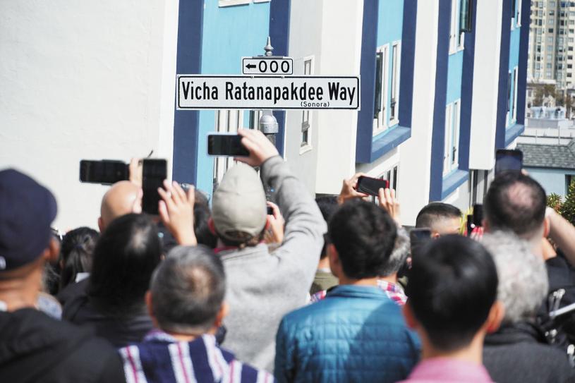 為紀念遭被非裔兇徒無故推倒墮地喪命的三藩市84歲泰裔老翁拉塔納柏克迪(Vicha Ratanapakdee),在泰翁遇害社區一條街道以他的姓名。出席昨天易名新街道揭幕儀式的,有:泰翁女兒 Montanus Ratanapakdee和市府律師邱信福、市參事司嘉怡(Catherine Stefani)、從洛杉磯趕來的泰國總領事Tor Saralamba,及社區領袖和政府官員等出席。疫情期間曾活躍於三藩市華埠的和平隊創辦人梁靈傑(Max)擔任大會主持。