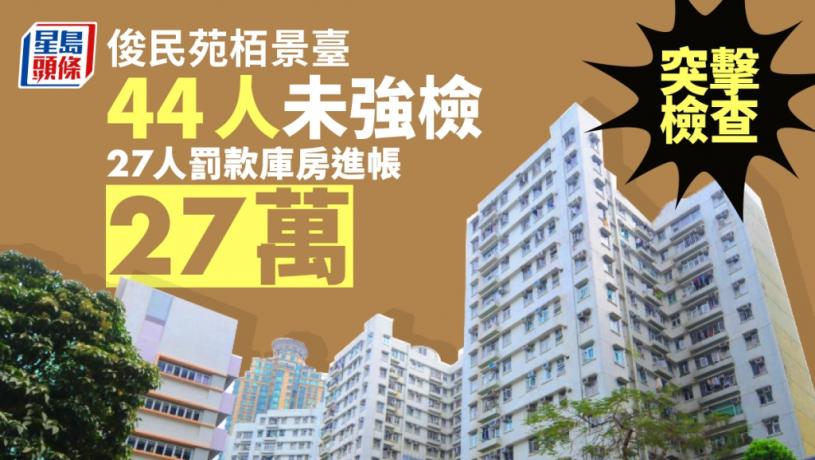 因應新冠肺炎強制檢測公告,政府今日分別突擊檢查何文田俊民苑文明閣和天后栢景臺一座,共發現44人未遵守強檢公告,當中27人被罰1萬元,庫房進帳27萬元。被罰款人士中,栢景臺佔上23人。