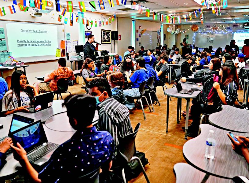 一名實習教師四出詢問學生,算出有多少人需要他協助伊斯蘭教歷史課的單元學習。一位資深數學老師在一堆課桌旁徘徊,指導大約50名新生完成幾何作業。一位科學老師檢查學生的作業,而一位英語老師則對著教室前面的麥克風講話,指導學生,學生保持進度。135名學生,四位老師,一間巨大的教室:這就是亞利桑那州梅薩校區韋斯特伍德高中(Westwood High)九年級的樣子。在那裡,一種創新的教學模式已經站穩腳跟,並正在該校區內外的其他學校推廣。