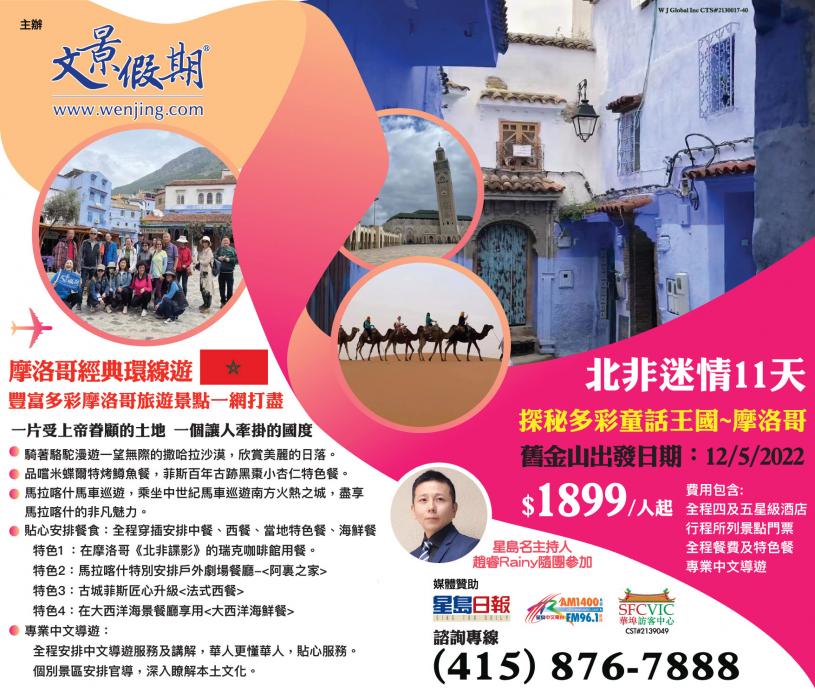 由文景假期主辦,星島日報,星島中文電臺, 華埠訪客中心媒體贊助,12月5日由舊金山出發的 “北非迷情”摩洛哥,蓄勢待發。文景假期與星島成功合作了多次境外境內遊,特別是去年疫情時多次成功舉辦了美國國內外的旅行團( 阿拉斯加、土耳其、夏威夷、歐洲遊等 ),深受灣區廣大僑胞的厚愛與支持!