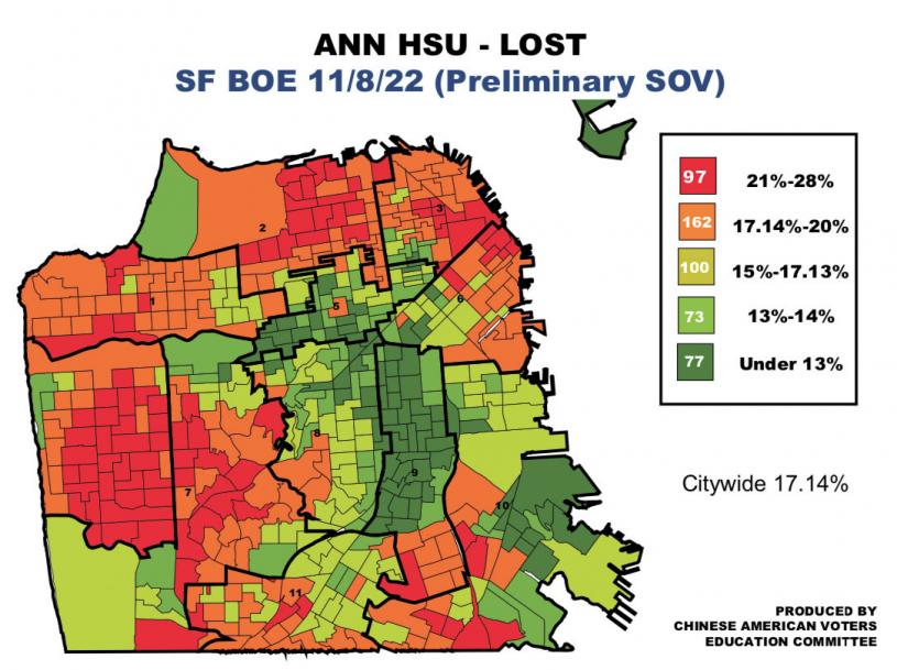 在教委選舉中,三名競選連任的教委都是在罷免選舉後獲市長任命接替教委席位的,其中徐安更是積極參與罷免運動的家長代表之一。李志威分析,徐安在11月選舉中仍然獲得華人選民支持,比如在三藩市多個華人較多的區,包括華埠、第一區、第四區(日落區)、第七區以及第十一區,她均獲得平均超過17%的華人選票。