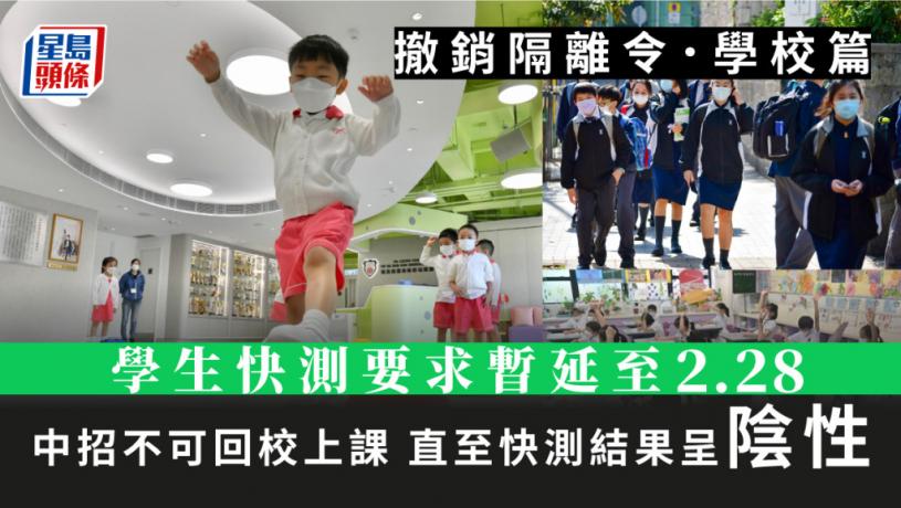 港府1月30日起撤銷新冠確診者隔離令,由於學生是重點保護群組之一,因此維持學生每日回校前快測要求,包括中學、小學、特殊學校及幼稚園,暫至2月28日。檢測陽性學生不可回校上課,直至快測結果呈陰性。