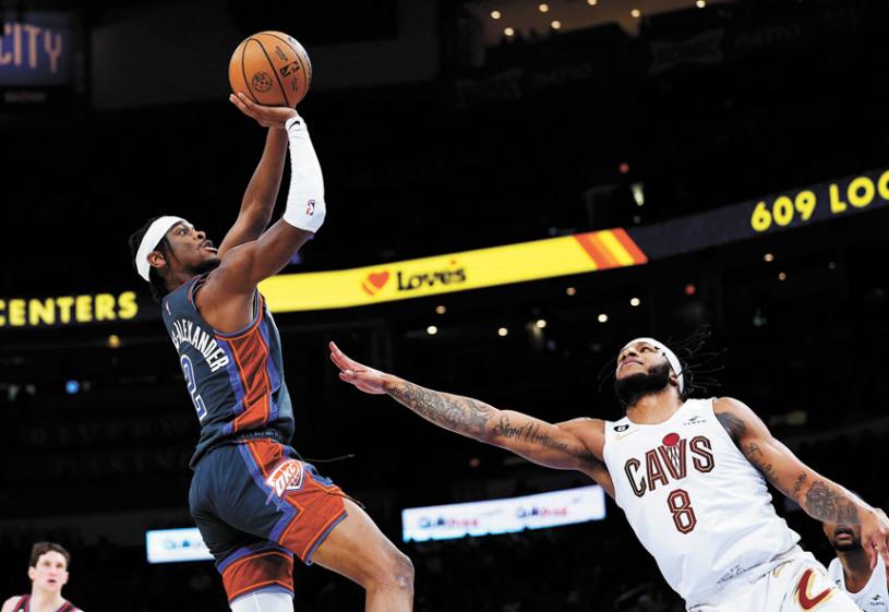 圖為雷霆球員亞歷山大(左)突破騎士隊球員防守投籃得分。路透社