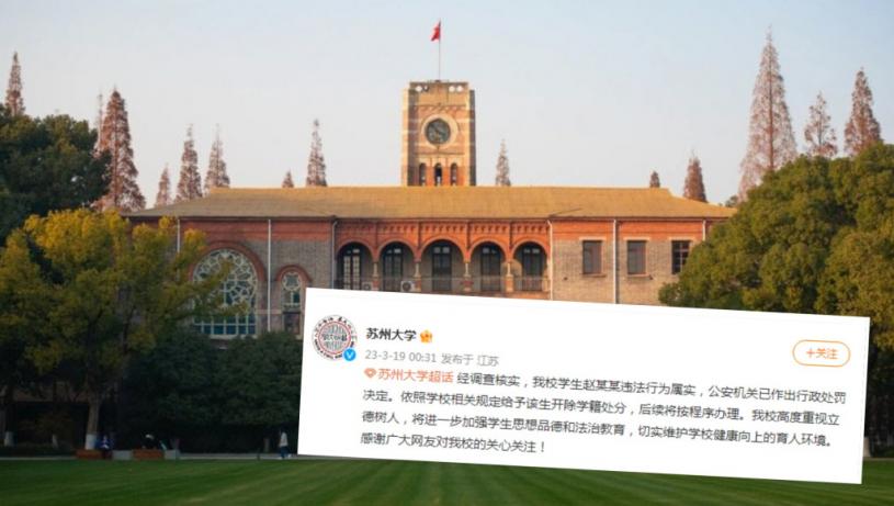 3月19日凌晨蘇州大學再發文表示,公安機關已對該學生作出行政處罰決定,校方依相關規定給予該生開除學籍處分。
