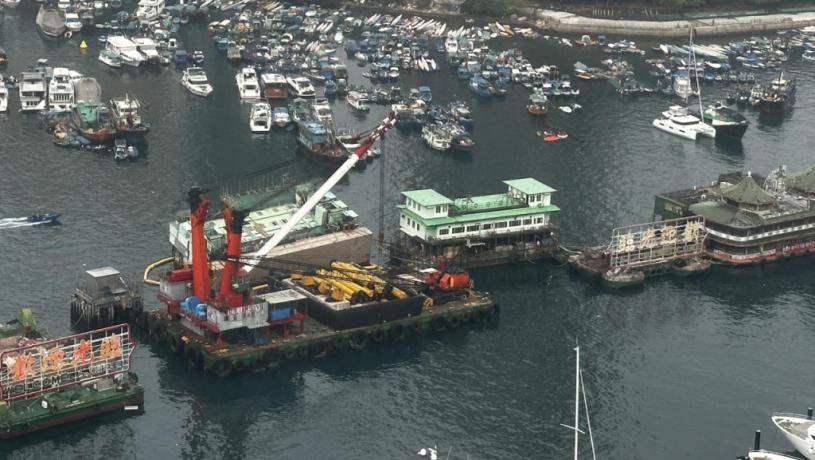 停泊在香港仔避風塘的珍寶海鮮舫,去年6月被拖離香港,及後遇上惡劣天氣而傾覆,至於其廚房船因事前入水傾側,而逃過一劫。廚房船被困避風塘內已超過9個月,至近日開始有起重船駛至廚房船附近,並用鐵索纏繞廚房船,據悉起重船準備月內將廚房船吊起。