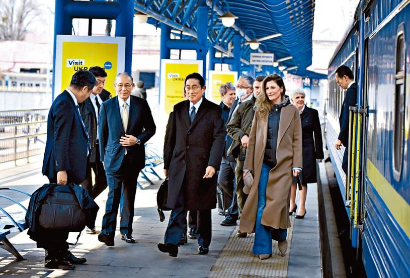 日本電視台NTV的畫面顯示,岸田從波蘭搭乘火車前往基輔。電視台拍攝到岸田於當地時間上午9時過後,在波蘭接近烏克蘭邊界的普熱梅希爾車站登上一列火車,他花了近10小時抵達基輔。