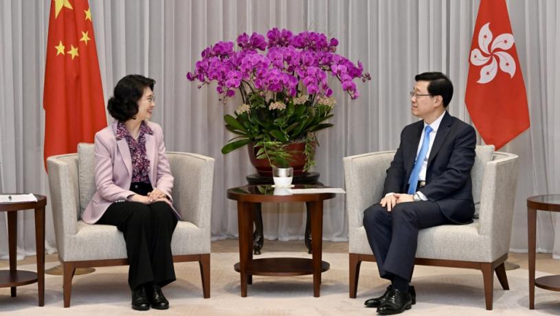 行政長官李家超今日(23日)與江門市市長吳曉暉會面,就加強港邑合作交換意見。政制及內地事務局局長曾國衞和行政長官辦公室主任葉文娟亦有出席。