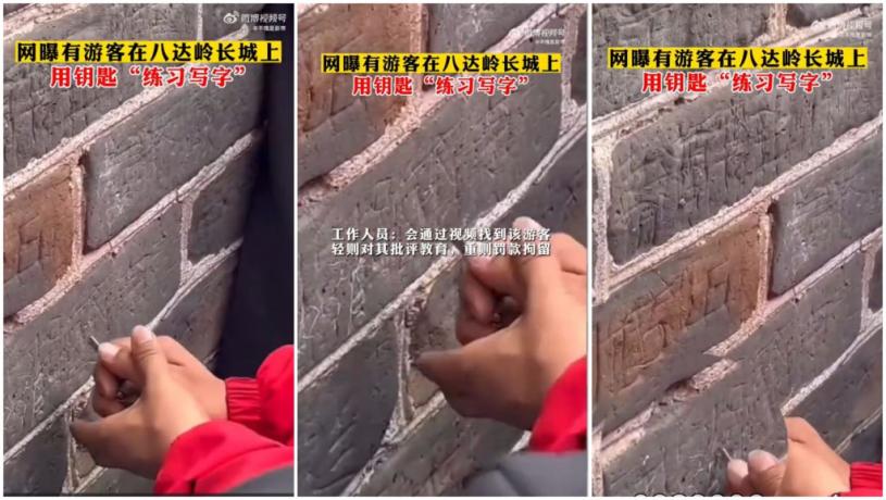 網傳視頻顯示,3月21日,有游客用鑰匙在長城城牆上刻字。爆料者稱,事發地在北京八達嶺長城。