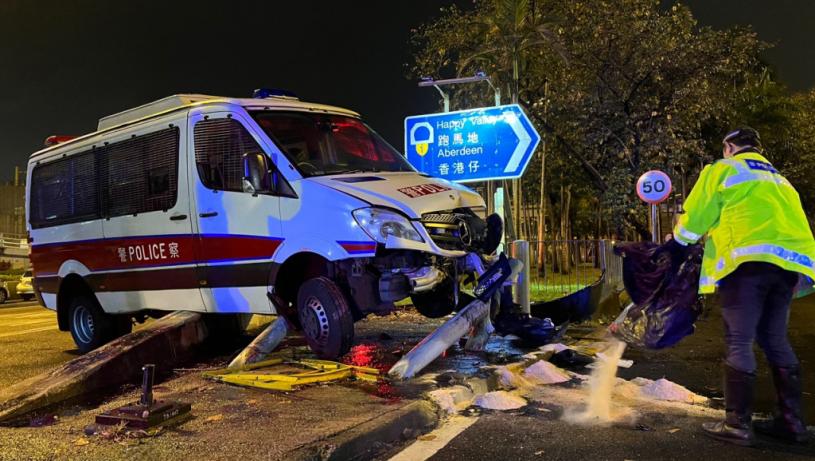 灣仔發生涉及警車的交通意外。今日(26日)凌晨4時許,一輛警車沿告士打道東行快線行駛,駛至近灣仔運動場對開一右彎時,警車疑天雨路滑失控,直剷上路中分隔石壆,整輛警車橫亘在路𡒊上。警車上1名男警及1名女警均沒有受傷,無需送院治理。事件中,警車撞毀3條防撞欄,車頭嚴重損毀,有偈油由警車漏出。據了解,涉事警車正前往軒尼斯道處理一宗交通意外,期間發生意外。警方正調查意外原因。
