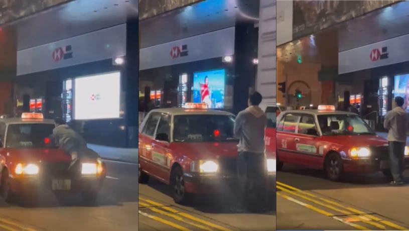 男子突掙脫女友人牽手站在的士車頭。(影片截圖)