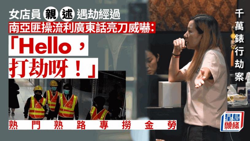 Winnie憶述昨日下午3時41分,她與姓黃負責人、一名女文員正招呼2名客人,其間4名穿上「地盤look」的南亞裔匪徒甫進入店內,其中兩名匪徒突然從袋內取出兩把利刀指向各人,並以純正廣東話呼喝「Hello,打劫呀!」當時五人被嚇至不敢動彈,女文員受威嚇下乖乖將夾萬及錶櫃鎖匙交出,惟對方不懂用鎖匙打開錶櫃,一度爆粗稱「唔x識開呀!」然後再用刀威嚇負責人為錶櫃開鎖,其餘2名匪徒則迅速分持紫色及灰黑色手提旅行袋擸走大量名錶,部分只取手錶,亦有部分連錶盒證書一同取走,歷時3分鐘內得手便迅即逃離現場。