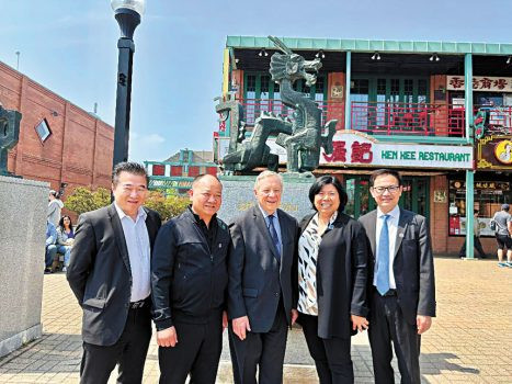 杜賓(中)、十一區區長李惠華(右2)、華商會會長李建明(右1)、董事長倪擧凌(左1)、董事陳健明(左2)在華埠廣場十二生肖雕塑前留影。 梁敏育攝
