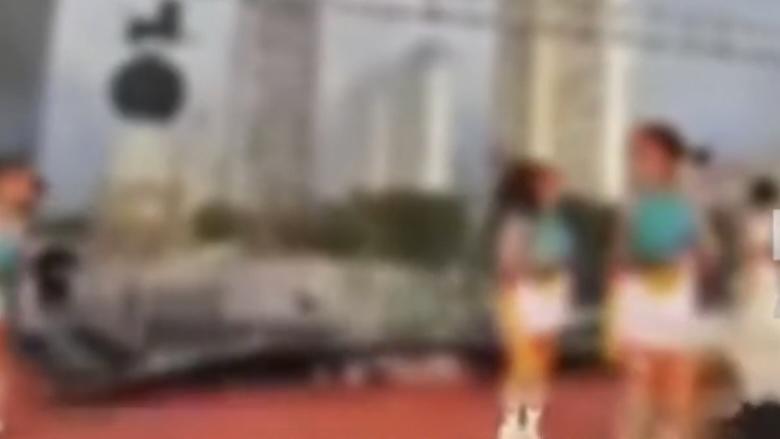網傳影片顯示,小朋友們面向台前跳舞做動作,多人走避不及,被壓在電子顯示屏下方。