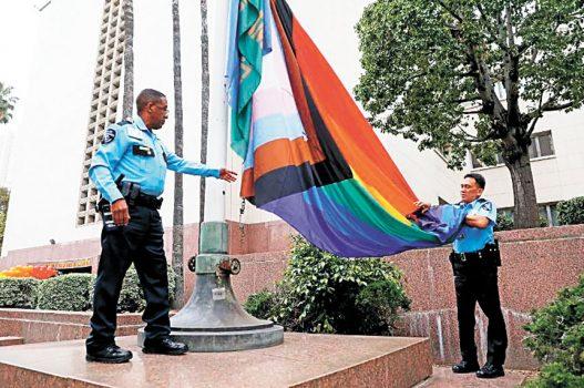 洛杉磯市中心的洛縣哈恩行政大樓升起驕傲旗幟。洛杉磯時報
