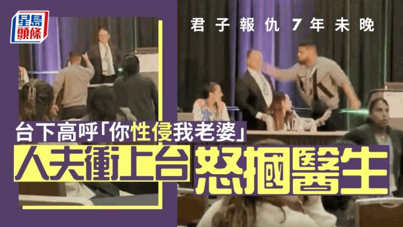 男子持續指著醫生咆哮,「你知道你做了甚麼…你7年前在紐約碰了我太太」,男子邊說邊指著站在台下的妻子,接著又甩了醫生一巴掌,「別當渾蛋。」
