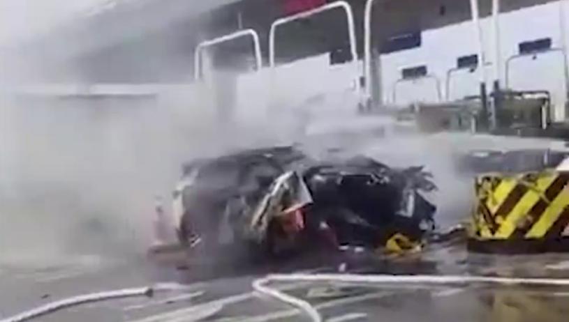 杭州有汽車撞收費站設施起火火致4死 ,有網民指肇事私家車疑似是電動車。