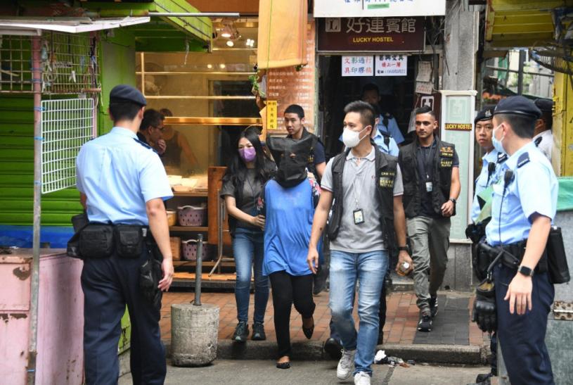 油尖警區反三合會行動組南亞裔主管SINGH GIMAN DEEP督察(右二)押同印裔女疑犯上警車。(楊偉亨攝)