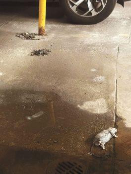 根據這位不具名的下東城政府樓居民介紹,相關圖片拍攝於位於南街(South St)286號的兩橋政府樓地下停車場。僅在圖片有限顯示的一車位地面,便有至少3隻老鼠屍體,其中靠近一旁停泊車輛的2具鼠屍已被碾壓至無形,僅尾巴和四肢大致可見,且已出現腐化;近鏡頭的一隻完整的鼠屍則已出現浮腫,倒在一灘水漬中。這名忍無可忍的居民表示,拍攝時現場正瀰漫著惡心的腐味,而類似現象早已在政府樓存在多年,但一直未見有人出面解決,包括政府管理委員會(NYCHA)亦未見有採取任何舉措。