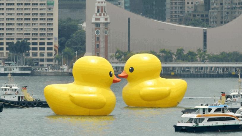 荷蘭藝術家(Florentijn Hofman)創作的巨型橡皮鴨事隔十年再臨香港,今次更首度攜伴來到維港。兩隻黃鴨今早(9日)進行預覽日暨啟航禮儀式,由灣仔慢游到中西區海濱長廊中環段展出,展覽明日(10日)起向公眾開放約兩星期。啟航禮前後,不少市民圍觀拍照。