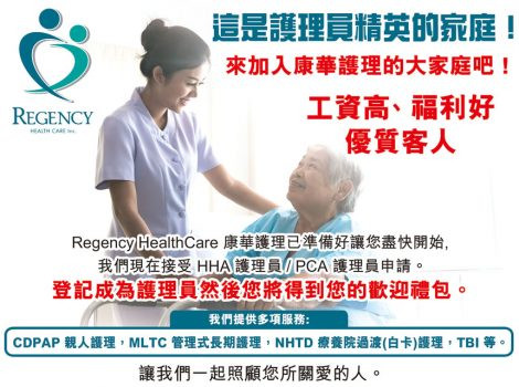 康華護理公司(Regency Health Care, Inc.)是一間紐約州註冊執照的護理公司,為紐約市五大區長者提供優質家庭護理服務。用專業、愛心關懷服務群眾,為社區提供卓越的服務已有15年。多年來我們一直與社區中心,醫療中心和其他相關機構密切的合作,提供親人家屬護理計劃,家庭護理計劃更注意的是人性化,以細心周到的服務,讓您舒適地在家中接受專業護理服務。是持證普通護理計劃及親人家屬和持證護理的多種類型護理計劃的公司。我們的理念是為您和您關愛的人提供最佳質量的家庭護理服務。