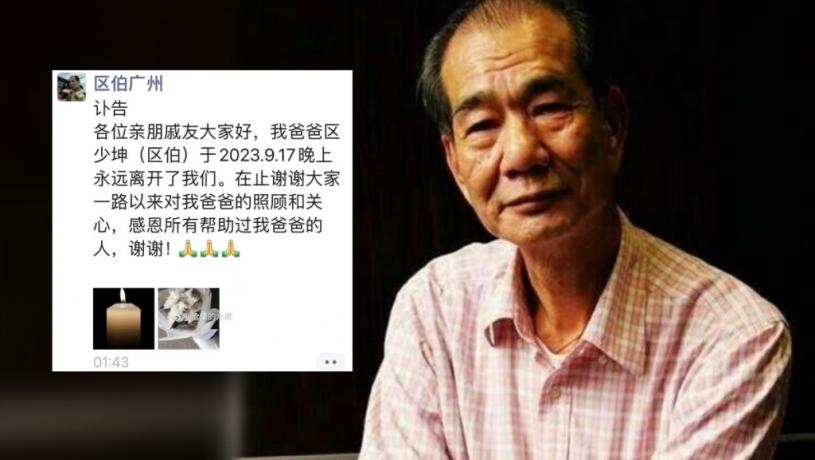 網上同時傳出疑似區伯家人代發的《訃告》,內容稱區少坤(區伯)於2023年9月17日晚上「離開了我們」,在此「謝謝大家一路以來對我爸爸的照顧和關心,感恩所有幫助過我爸爸的人,謝謝!」