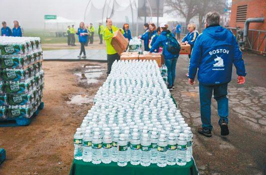 今年波士頓馬拉松比賽開始時,數千個塑料水瓶被放置在運動員村。ERIN CLARK/GLOBE STAFF