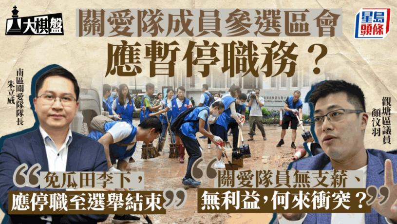 南區關愛隊隊長、香港島各界聯合會常務副理事長朱立威表示,關愛隊成員倘參選應避嫌,暫停職務直至選舉結束,以免瓜田李下。至於關愛隊在選舉期間的經費應否扣減,他認為參選屬關愛隊個別成員的事情,關愛隊作為一個整體,服務不會停止,經費不應受影響,但關愛隊隊員不能以關愛隊身份,包括穿上有關愛隊字眼的制服,去為他人拉票或助選。