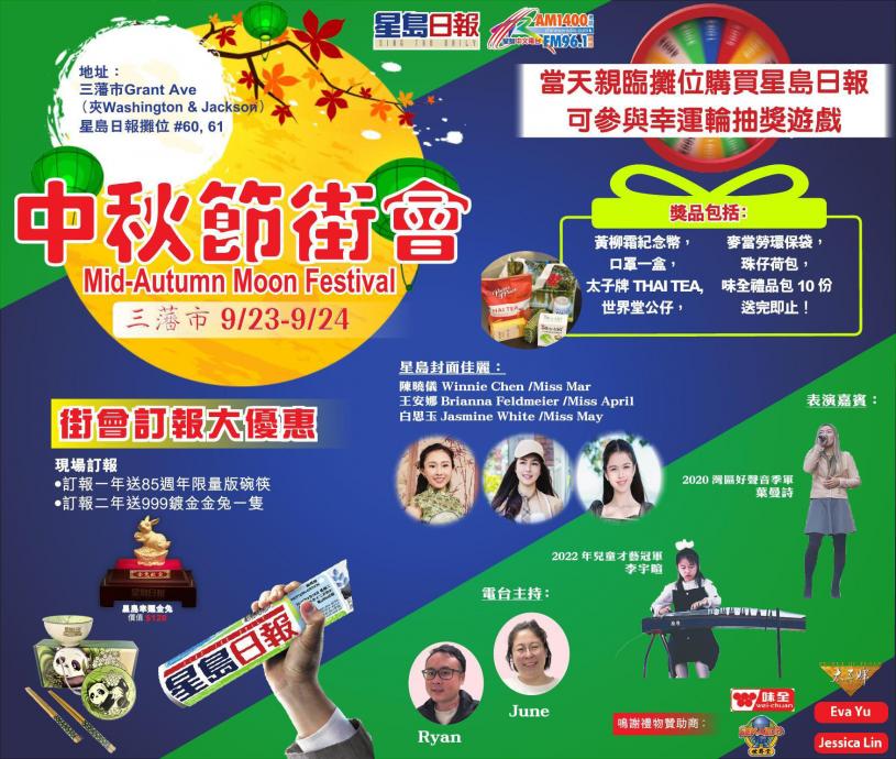 這次的中秋街會繼續在華埠的都板街舉行。 從California街一直貫穿至Broadway大道。 星期六上午11點將由三藩市市參事在主舞臺主持開幕典禮。 而星島電臺將於星期日2點45分到3點45分主舞臺上同觀眾們玩遊戲送禮物! 並特邀 2020灣區好聲音季軍 葉曼詩與2022年兒童才藝冠軍 李宇暄上臺表演。 希望華埠的居民,商家和外地的遊客能夠在中秋街會感受到喜氣洋洋的節日氣氛並能夠玩得盡興。讓星島為疫後華埠經濟復蘇繁榮做出一份努力。