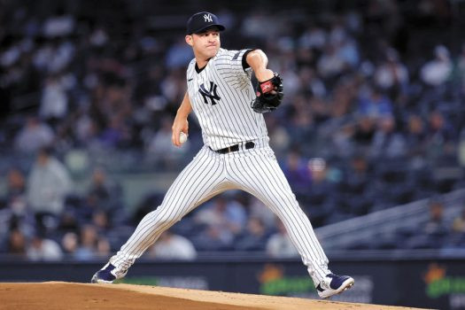 揚基先發投手金恩在對陣藍鳥的第一局比賽中投球。路透社