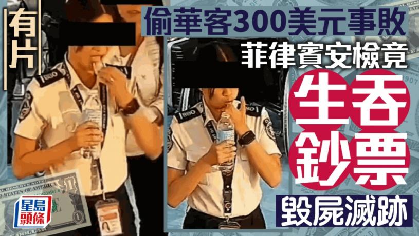 機場安檢人員監守自盜,事敗竟即場圖滅證,生吞美金。壣道指,菲律賓一名機場女安檢員,在盜取一名中國旅客300美元(約2,367港元)後被發現,竟然當場把贓款放入口吞落肚,企圖消滅證據。最終被閉路電視鏡頭拍下作案過程,涉事女安檢已遭停職調查。