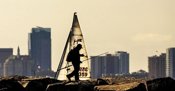 近期一名釣魚者沿著長堤碼頭散步。洛杉磯時報