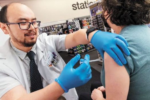 南加州鷹岩CVS藥劑師Aaron Sun 替Jennifer Grappone注射新疫苗。洛杉磯時報
