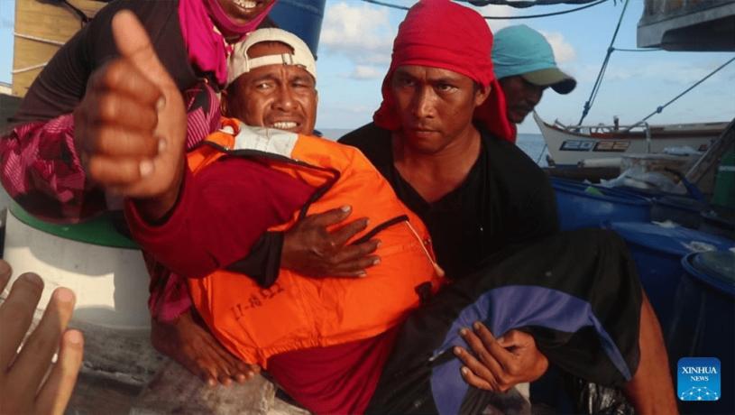 獲救菲律賓漁民豎起大姆指以示感謝。 Xinhua