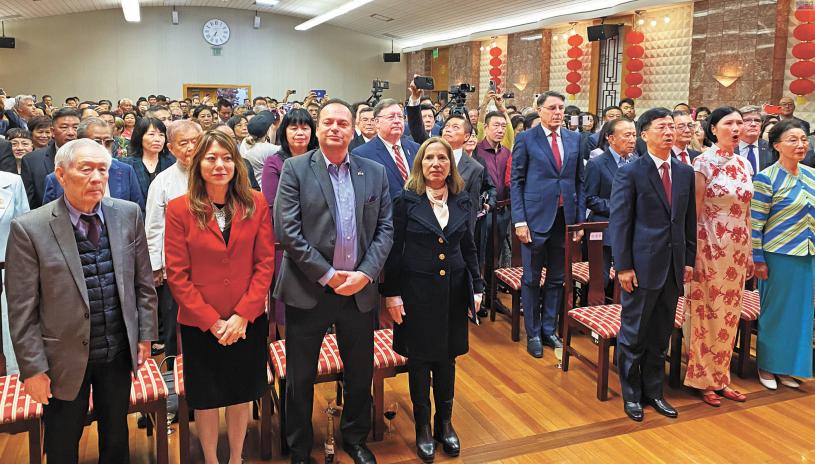 加州副州長康伊蓮(Eleni Kounalakis)、財務長馬世雲(Fiona Ma)、州政府運營華裔秘書長黃思敏(Amy Tong)、三藩市首席禮賓官穆杜羅格魯(Maryam Muduroglu)等,知名僑領方李邦琴、池洪湖等約500位嘉賓出席國慶74周年招待會。黃思敏代表紐森州長、務長馬世雲分別向張建敏總領事頒發賀狀。