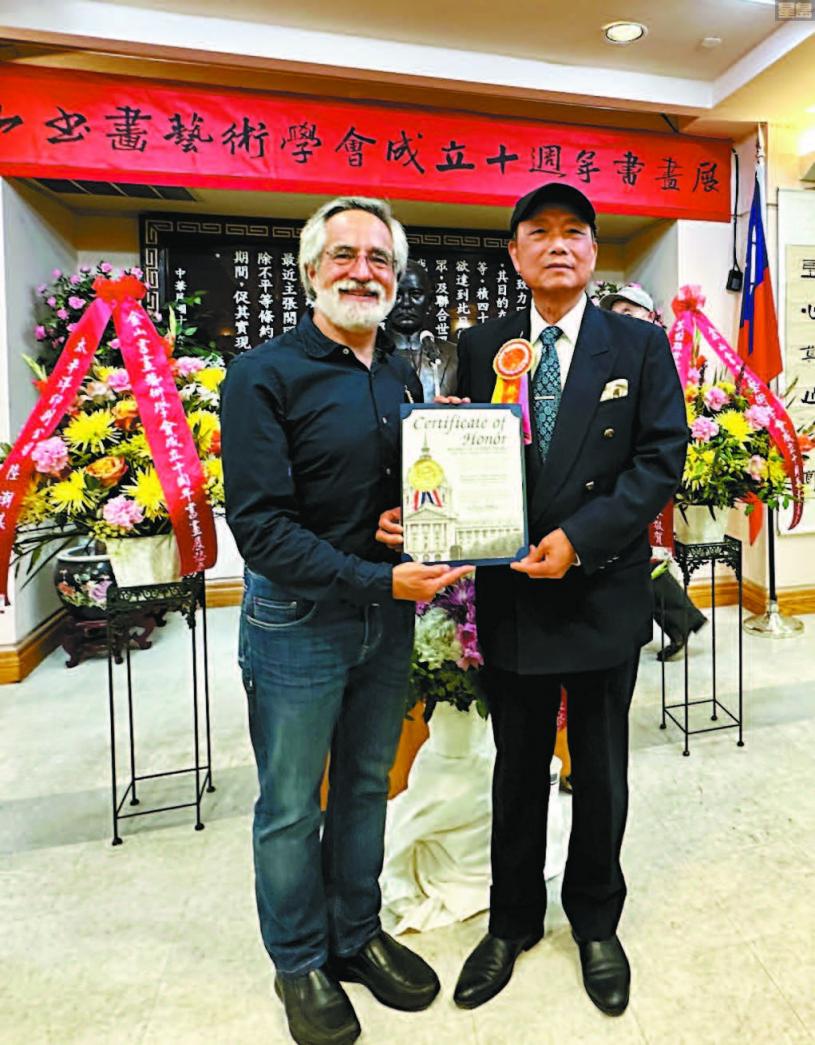 加州財務長馬世雲的代表鄧佳妮和三藩市議會主席佩斯金分別發祝賀獎,市參事陳詩敏向書畫展總策劃林華昌會長和八位參展作者,包括:謝世明、甄雅勝、胡德基、陸潮基、江達才、李錫華、雷祖舜、和葉仲明頒發榮譽證書並合影留念。