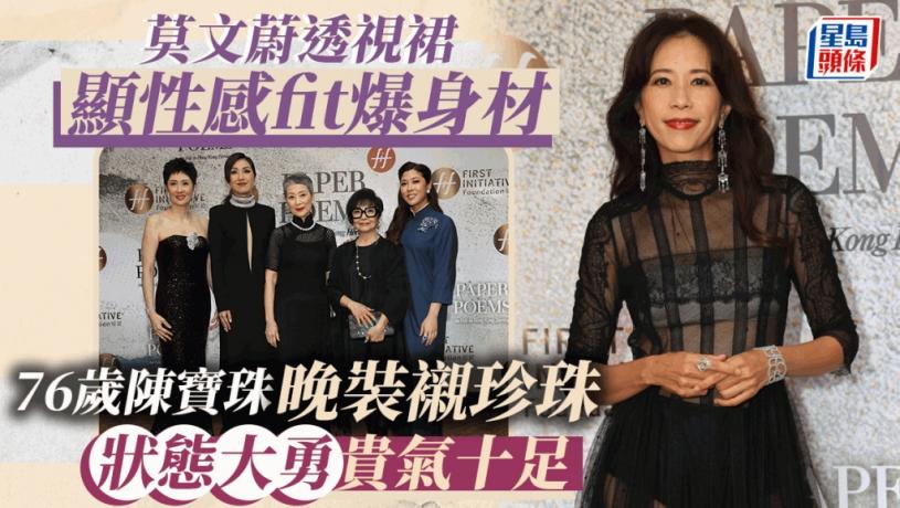 領賢慈善基金(FIF)「紙藝詩翩」慈善晚宴今晚在四季酒店舉行,陳寶珠與兒子楊天經和新抱吳文珊、梅雪詩、張敬軒、楊千嬅及莫文蔚等亦有出席。當中以身穿黑色透視裙現身的莫文蔚最性感,陳寶珠與梅雪詩同樣身穿黑色連身裙現身,陳寶珠戴上珍珠項鍊及耳環,而梅雪詩則搭配法國品牌Van Cleef & Arpels項鍊,同樣充滿貴氣。