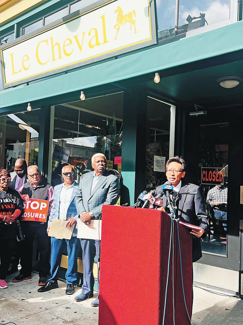 上百名屋崙罷市行動的支持者26日上午聚集在市中心區的Le Cheval越南風味餐廳前,抗議治安不靖政府施政不力,呼籲採取切實措施幫助小商業。該家經營38年的餐館定於本月底結業,原因是治安變差導致客源減少。