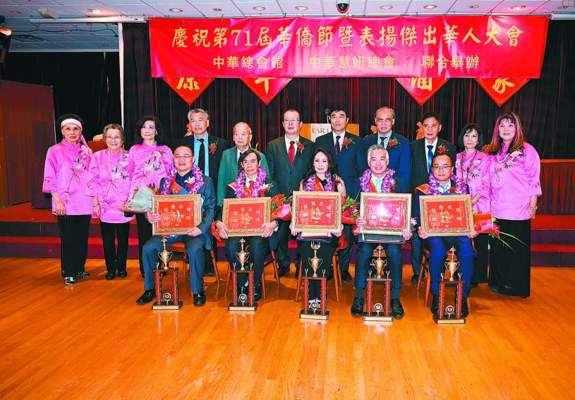 (僑社記者馬紅兵報導 )中華總會館、中華慧妍總會於10月14日中午假座華埠康年酒家聯合舉行第七十一屆華僑節暨二十四屆傑出華人頒獎典禮。三藩市市長布里德、市參事佩斯金、市地檢官謝安宜親臨;州參議員威善高、州眾議員丁右立、市政府大律師邱信福、市參事陳詩敏等派代表蒞臨祝賀並頒發賀狀;中華總會館總董暨寧陽總會館主席李燦桐、合和總會館主席謝躍池、肇慶總會館主席張耀廷;岡州總會館主席黃國康、三邑總會館主席楊國興、通事劉榮浩、中文助理李殿邦;中華慧妍總會會長高慧琍、共同創辦人李人芝;大會主席蘇淑君;名譽會長方謝潔霞;第一副會長劉李美芳、第三副會長黃筱雅;英文書記黃廖雪萍;董事張曉春、柯維玲、熊素珍、吳賽英,以及各僑界首長、嘉賓出席慶會。柔功門醒獅健兒親臨,歡騰躍舞,呈送吉祥,為慶祝活動拉開序幕。董事柯維玲擔任慶會司儀,她表示中華總會館與慧妍總會聯合舉行華僑節活動,目的鼓勵對社會有卓越貢獻的華僑華人,表彰他們在各行業崗位上努力拼搏,貢獻良多,他們是華人的驕傲,華人的光榮。