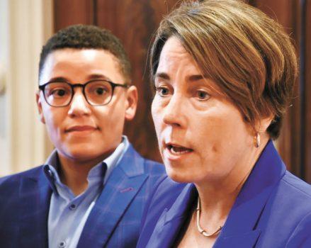 蒂比特斯˙納特宣誓就任交通部長後,希利州長接受記者採訪。 Chris Christo/Boston Herald