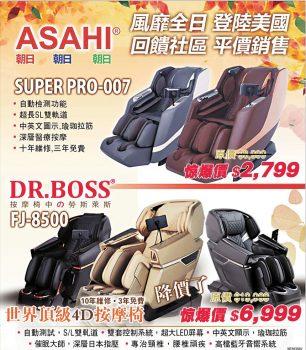 風靡全日本,有「按摩椅中的勞斯萊斯」美譽的ASAHI朝日醫療按摩椅,如今強勢登陸美國,閃耀登場。為回饋客戶,感恩節期間,代理商北美朝日醫療按摩椅集團,型號SUPER PRO-007原價$8,999,現以驚爆價$2,799銷售,是感恩長輩慈愛呵護或是犒賞自己辛勤打拚的最佳禮物。