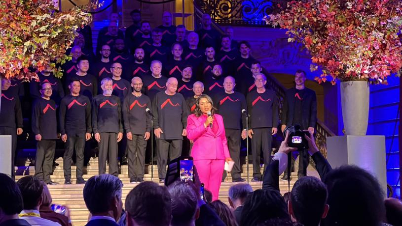 三藩市男同合唱團在大廳台階上為來賓們帶來表演,三藩市米慎區、