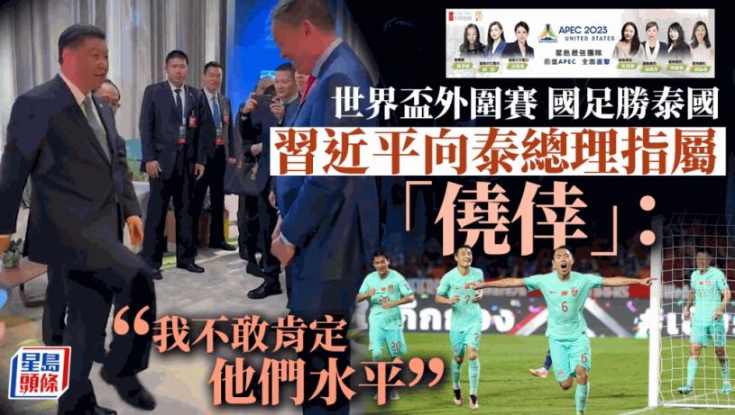 國家主席習近平17日與泰國總理賽塔在亞太經合組織(APEC)峰會峰會期間短暫寒暄的視頻,昨日在網上流出。兩人興致勃勃地談論足球,當賽塔談到中國男子足球隊近日戰勝泰國後,習近平幽默地稱:「但是我覺得,僥倖成分大,因為我現在對我們國家的足球隊呢,我不敢肯定他們的水平,有起伏。」現場一片笑聲。