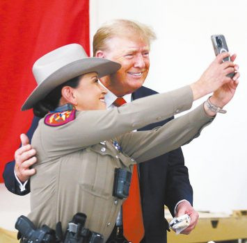 圖為前總統特朗普走訪在感恩節期間駐紮在南部邊境的德州國民警衛隊士兵,與他們合影留念。 美聯社