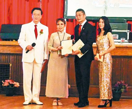 黃埜律師(右二)頒發州長嘉獎狀給朱莉小姐(左二)。李强攝